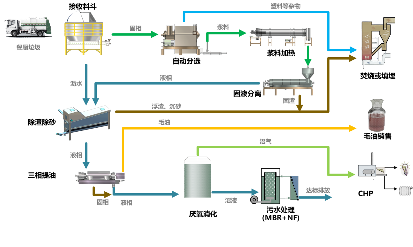 为了更充分的提取油脂以及把有机质转化成沼气,餐厨垃圾首先要经过 “自动分选-浆料加热-固液分离”等一系列工艺处理。